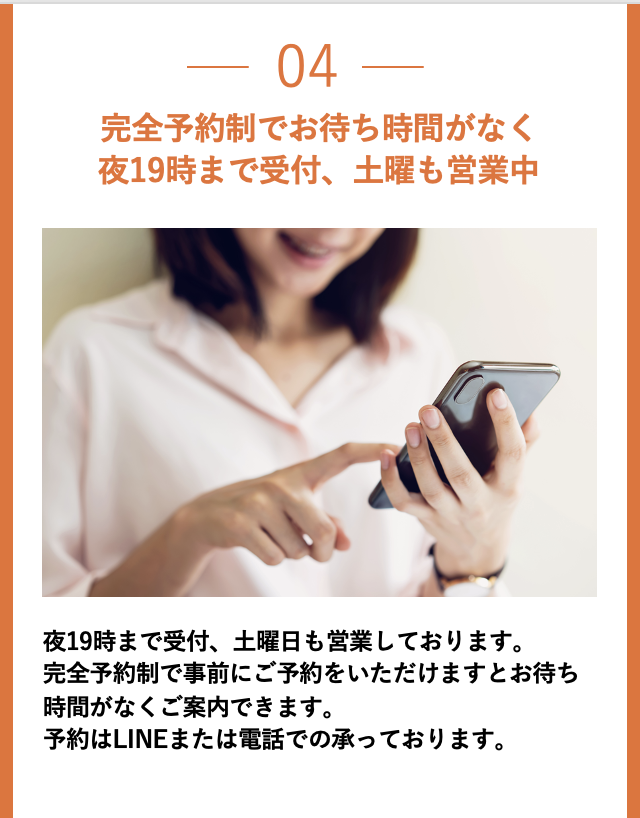| 予約・営業時間 | 完全予約制。前もってご予約ください 平日9時〜19時 (定休日:木曜日・日曜日・祝日) |